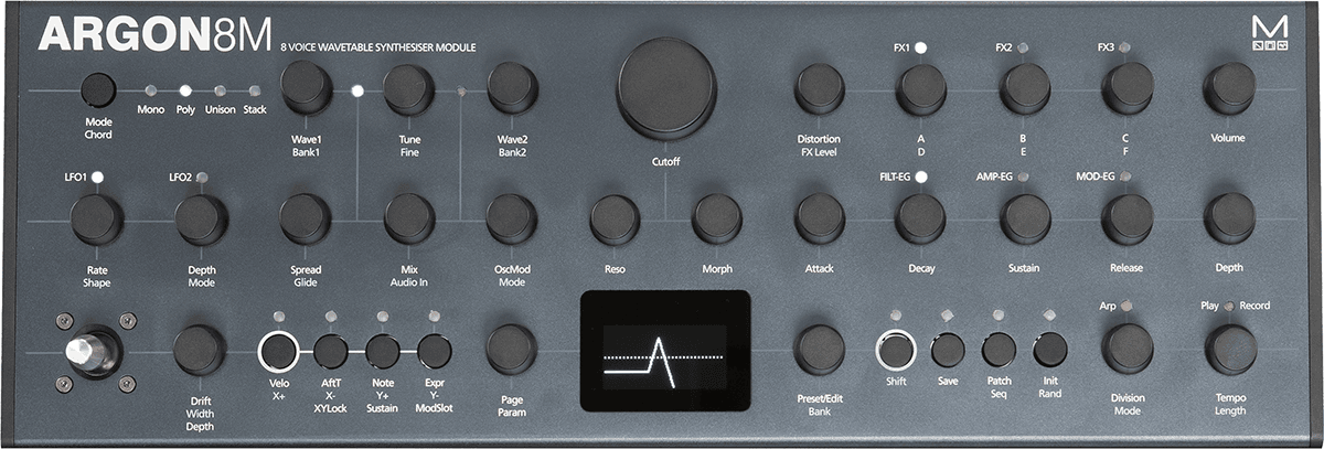 - 32 oscillateurs de table d'onde haute résolution, 4 par voix, avec 8 types de modificateurs d'oscillateur incluant : Phase Mod (FM), Ring Mod, Amp Mod, Hard Sync et Windowed Sync