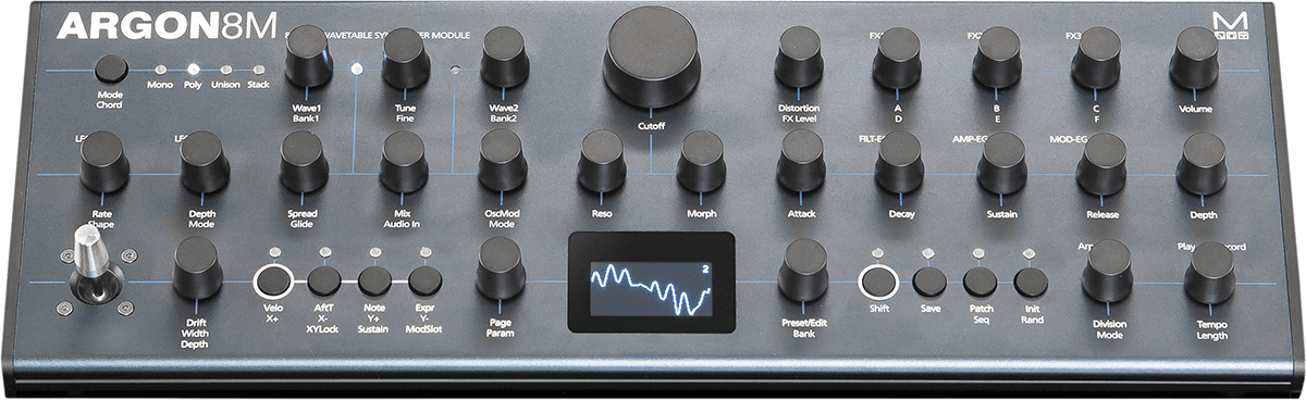 - 120 tables d'onde fabriquées avec soin, divisées en 24 banques de 5 jeux de formes d'onde morphables, couvrant les classiques analogiques virtuels jusqu'à l'EDM de pointe et de nombreux modèles repris du Modal 002 original, ainsi qu'une gamme complète de tableaux générés mathématiquement. Banque PWM supplémentaire et 4 banques de bruit/modulation accessibles sur l'oscillateur 2