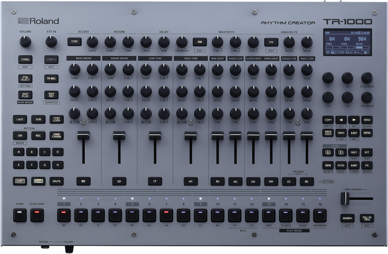 La TR-1000 Rhythm Creator est la première boîte à rythmes Roland véritablement analogique depuis 40 ans. Intégrant des instruments analogiques TR-808 et TR-909 Roland avec de plus larges gammes d'accordage et d'atténuation, et un plus grand contrôle des dynamiques.
