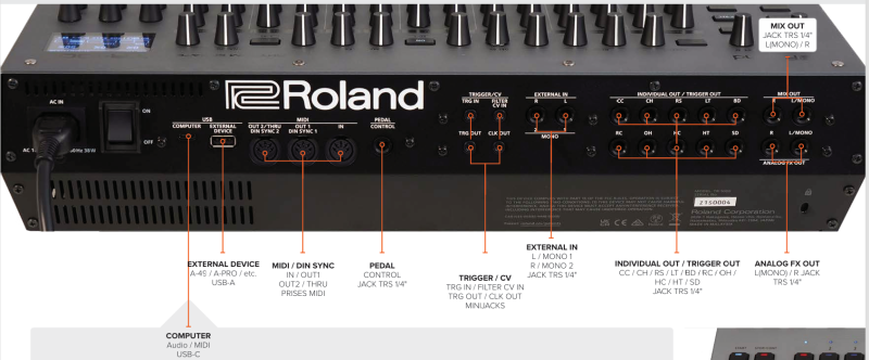 ● les classiques sons analogiques TR Roland, de puissants processeurs numériques et un échantillonnage stéréo pour créer des rythmes uniques.
