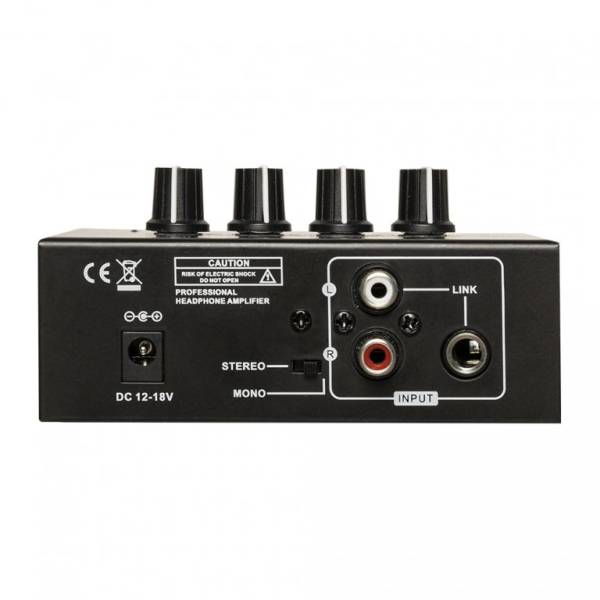 INPUT SECTION: 2x RCA connectors + 1x TRS Jack 6,3mm (1/4”) plug. RCA’s and jack are linked together. If one of the two solutions is used, the signal can be sent to another device via the free connector.