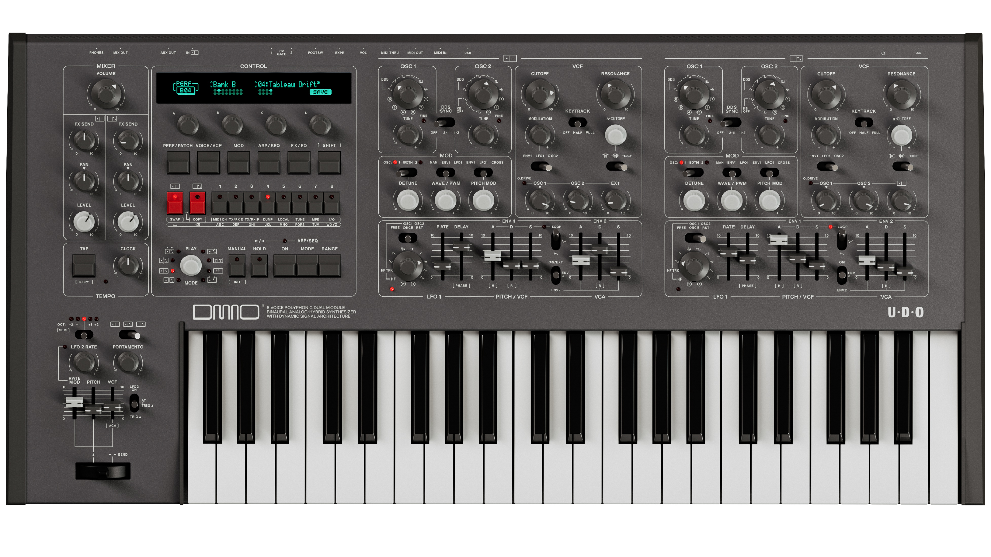 Les deux synthétiseurs indépendants et complets (DMNO 1 et 2) occupent une place centrale, chacun doté de ses propres commandes en façade. Les deux DMNO (timbres) sont pilotés par deux oscillateurs numériques à très haute fréquence d'échantillonnage et haute résolution, alimentés par FPGA, et acheminés vers un filtre analogique stéréo exceptionnellement puissant et polyvalent (voir plus loin pour plus de détails sur les filtres).