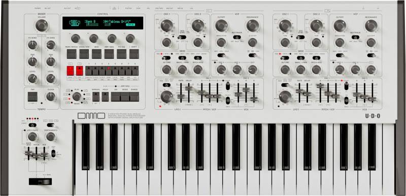 Une nouvelle approche de l'analogique. DMNO fusionne le son hybride emblématique d'UDO avec une architecture de contrôle avant-gardiste, ludique et performante. Sa polyphonie à huit voix, ses deux moteurs de synthèse binaurale hybrides et son tout nouveau système de filtre stéréo multicœur dynamique analogique par voix offrent une palette sonore d'une grande richesse, allant de scènes texturées saturées et extrêmes à une chaleur analogique riche et organique. Chaque moteur dispose de ses propres commandes dédiées.